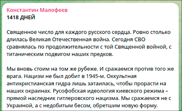 Что касается совпадения сроков СВО и Великой Отечественной войны, то, конечно, любой, кто проводит такую аналогию, должен быть последовательным.