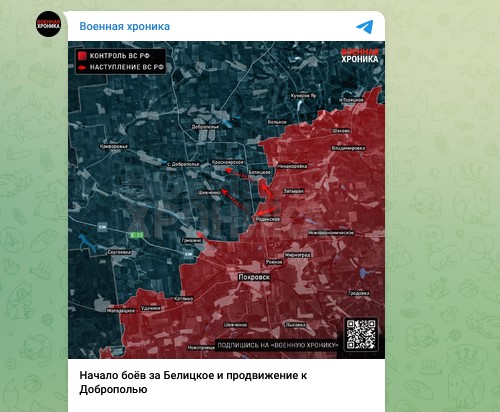 Тем временем аналитики "Военной хроники" обращают внимание на начало боёв за Белицкое и продвижение к Доброполью. По словам экспертов, сначала подразделениями группировки войск "Центр" были взяты под контроль и зачищены две протяжённые лесополосы в 800 м северо-западнее железнодорожной станции Родинская, после чего штурмовые группы выбили формирования 78-й ОДШБр и 38-й ОБрМП ВСУ ещё из одной цепи опорников западнее улицы Шахтёрской Славы.
