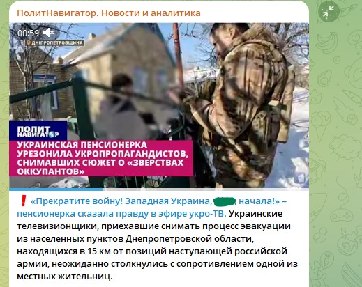 Неожиданно для киевских пропагандистов в сюжет вмешалась местная жительница, заявившая, что войну начала Западная Украина, силами которой провернули в стране госпереворот. Женщина добавила, что населённые пункты страдают от обстрелов со стороны ВСУ, а её сына, который уехал в Россию, теперь превратили во "врага народа".