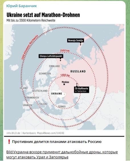 Мало того, издание отмечает, что на Украине разработан БПЛА "Сокол-3000", способный преодолевать свыше 3 тыс. км. То есть под ударом ВСУ окажутся примерно 80 военных баз в Мурманской области, в числе которых "Оленья", где базируются стратегические бомбардировщики, "регулярно участвующие в атаках на Украину".