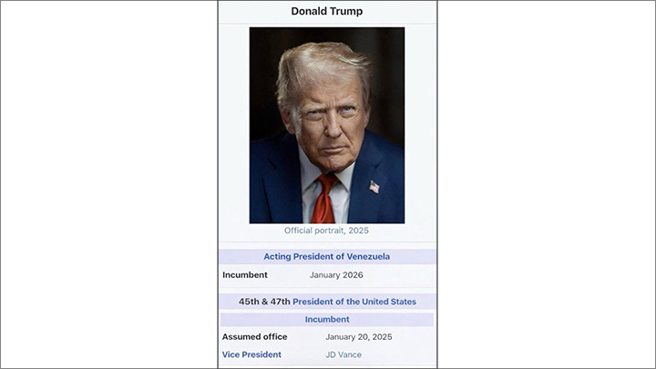 Трамп объявил себя "исполняющим обязанности президента Венесуэлы" и выложил в своей соцсети скриншот, стилизованный под "Википедию". Фото: TruthSocial