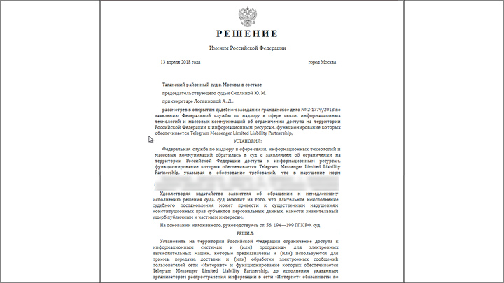 Решение Таганского суда Москвы о блокировке Telegram. Скриншот: Официальный портал судов общей юрисдикции города Москвы