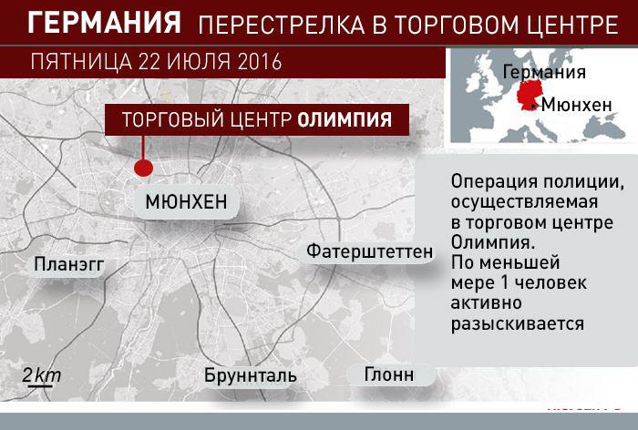 "В пятницу, 22 июля, в 17:50 (по местному времени) очевидцы сообщили о стрельбе в районе Ганау-стрит, а также в торговом центре "Олимпия". Видели трех разных людей с оружием. В настоящий момент нет информации ни о типе оружия, ни о точном числе жертв и пострадавших. Все силы брошены на поиск и поимку преступников. В том числе в городе работают агенты специального назначения, федеральная полиция, силовики из соседних городов Германии. Пока ни один из стрелков не был задержан.