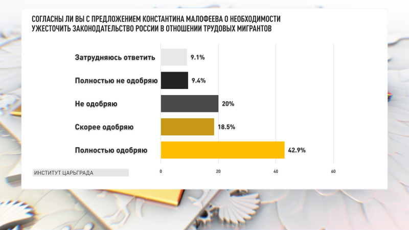 Что именно одобряют русские люди, ставшие участниками опроса? В программе "Царьград. Главное" Константин Малофеев назвал несколько первоочередных мер. По его мнению, необходимо ужесточить цифровой контроль над приезжими. Он обратил внимание, что хотя граждан России буквально загоняют в пресловутый "цифровой концлагерь", одновременно гастарбайтеры, число которых в России уже может доходить до 10-15 млн человек, де-факто предоставлены самим себе: