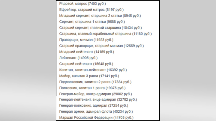 Базовые ставки окладов по воинскому званию. Скриншот с сайта voensud-mo.ru