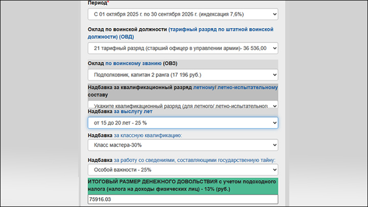 С исходными данными условного подполковника медицинской службы денежное довольствие составит 75 тысяч рублей. Скриншот с сайта voensud-mo.ru