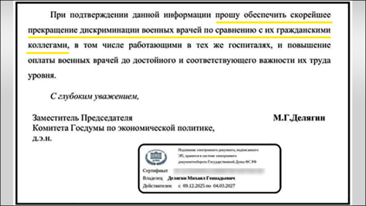 Депутат Госдумы Михаил Делягин попросил министра обороны разобраться с проблемой дискриминации военных врачей. Скриншот с ТГ-канала DELYAGIN's special