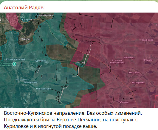 Ряд украинских и проукраинских источников на Западе сходятся во мнении, что купянский участок может превратиться для Сырского в ловушку. С одной стороны, у РФ на этом направлении действительно были и остаются проблемы. <…> С другой стороны, любая попытка проверить эту гипотезу на практике и до выполнения задачи по возврату Купянска по административным границам под полный контроль ВСУ требует переброски туда наиболее боеспособных механизированных бригад и подразделений БПЛА. <…> значительная часть этих подразделений снимается с направления Славянск – Краматорск, где они будут нужны в ближайшее время. По мере давления РФ на Константиновку и выхода к Дружковке Сырскому придётся срочно затыкать ещё одно угрожающее направление,