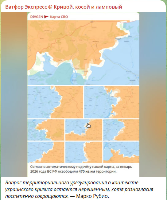 Собрал оценки продвижения ВС России на фронте за январь 2026 года от наиболее известных осинтеров и других оценщиков, наших, вражьих и западных. Вот такой разброс мнений. <…> ГШ ВСУ вообще живёт в параллельной реальности (заявил, что "освободил более 160 кв.км"). По моей субъективной оценке, ближе всего к истине цифра в 380-390 км. Ещё около 200-250 кв.км полоса боевого соприкосновения, где наблюдается "слоёный пирог" с нашим преобладанием, и около 500 км "серых зон", где нет никого кроме дронов,