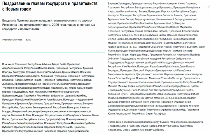 Ежегодная традиция президента России Владимира Путина направлять новогодние и рождественские поздравления зарубежным лидерам – один из дипломатических инструментов, отражающих политические приоритеты и динамику международных отношений. По случаю наступающего 2026 года Кремль сегодня ровно в полдень обнародовал список адресатов, в который вошло более трёх десятков действующих и несколько бывших глав государств и правительств.