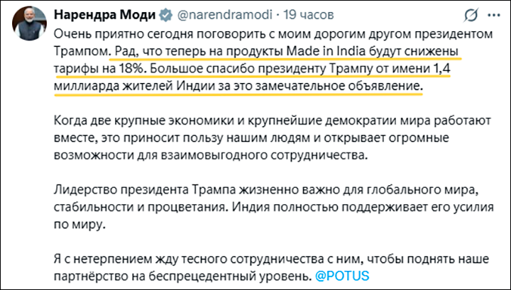 Ого! Дональд Трамп заключил очередную сделку. С Индией. Переговорив по телефону с её лидером Нарендрой Моди, президент США объявил в своей социальной сети: согласована торговая сделка между обеими странами, и она "вступает в силу немедленно". "США будут взимать пониженные... пошлины, снизив ставку с 25% до 18%", а Индия будет постепенно снижать свои и устранять нетарифные барьеры с целью их доведения "до нуля".