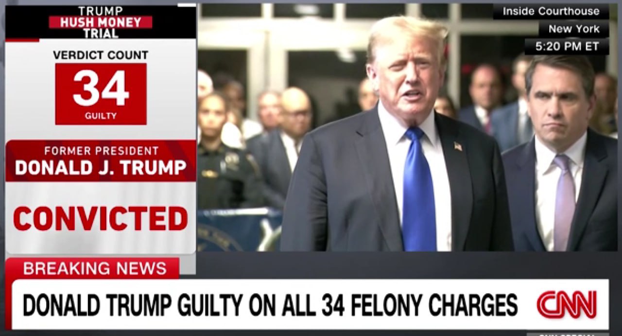 Итак, свершилось! Либеральный истеблишмент США, бросивший всю свою финансовую и административную мощь на политическое уничтожение Трампа, может праздновать промежуточную победу. По первому из четырёх уголовных дел, ведущихся против Трампа, присяжные нью-йоркского суда признали его виновным по всем 34 пунктам обвинения.