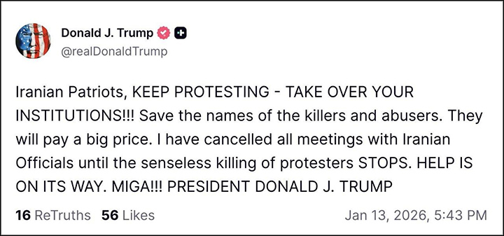 Это видно даже из слов Трампа, заявившего в интервью CBS, что "помощь" иранцам, дескать, "уже в пути". Но оказывается, речь идёт о помощи "в разных форматах". В том числе – "экономической" (выделят деньги?) для противников иранского режима. И что, так выглядят "очень решительные действия?"