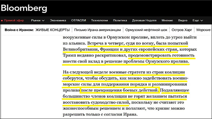 Вопрос на засыпку: если европейцы на все голоса поют, что не будут "освобождать" Ормузский пролив, зачем они собирают "военных стратегов"? Скриншот: интернет-сайт bloomberg.com (автоперевод)