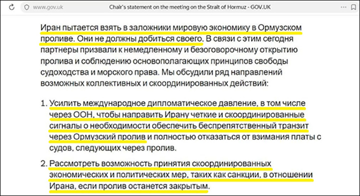 Ради чего, собственно, собирались в онлайне представители четырёх десятков государств, Евросоюза и Международной морской организации, прояснило официальное заявление организатора и "хозяина" конференции, т.е. правительства Великобритании. От имени главы МИД Иветт Купер сообщалось, что главной темой обсуждения стала ситуация в Ормузском проливе.