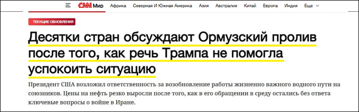 По его словам, Америка, которая с подачи Израиля и устроила нынешний кризис на Ближнем Востоке, никому ничего не должна и не зависит от поставок нефти и газа через Ормузский пролив. А значит, те, кто от этого трафика зависит (то есть все вышеперечисленные), должны сами прийти/приплыть/прилететь и разблокировать пролив.