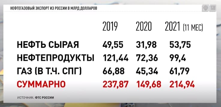 Несмотря на провал 2020 года, показатели восстанавливаются, и за 11 месяцев 2021 года нефтегазовый экспорт практически достиг значения 2019 года. Но есть и декабрь, статистика по которому ещё не пришла, так что, скорее всего, окончательные цифры превзойдут допандемийные показатели.