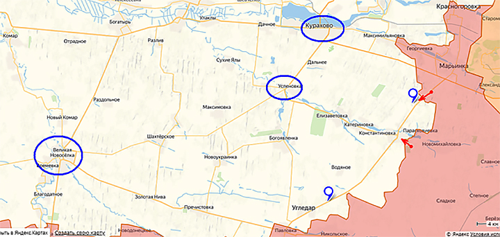 Наступая с востока на запад, наше командование пытается создать "вилку", северный зубец которой нацелен непосредственно на Курахово, а южный метит в Успеновку. Успех на любом из этих направлений оставляет Угледарскую группировку на голодном пайке.