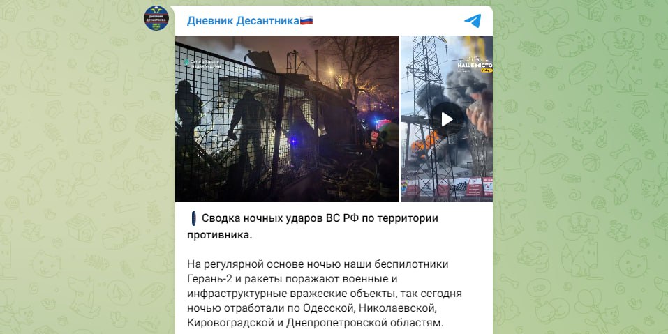На регулярной основе ночью наши БПЛА поражают военные объекты, интересно, что эти кадры показывают и в укранских телеграм-каналах. /Скрин тг-канал Дневник десантника.