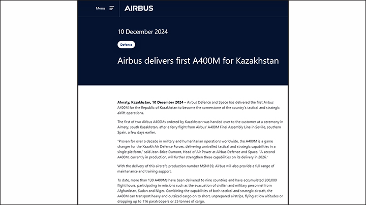 Авиагигант отчитывается о сотрудничестве//Скриншот страницы сайта Airbus