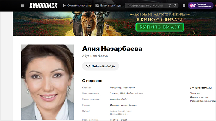 Алия Назарбаева является кинопродюсером и пишет сценарии//Скриншот страницы сайта "Кинопоиск"