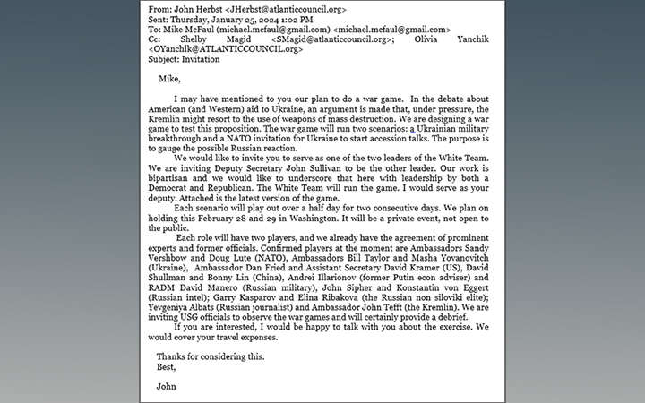 Телеграм-канал "Макфлуд", который специализируется на разоблачении деятельности экс-посла США в России Майкла Макфола, отмечает, что экспертом на штабную игру Atlantic Council был приглашён как раз бывший посол. Ему предстояло оценить, как русское общество отнесётся к событиям, когда Украина займёт часть наших "старых территорий". Соответствующие документы были найдены "среди документов Майкла Макфола".