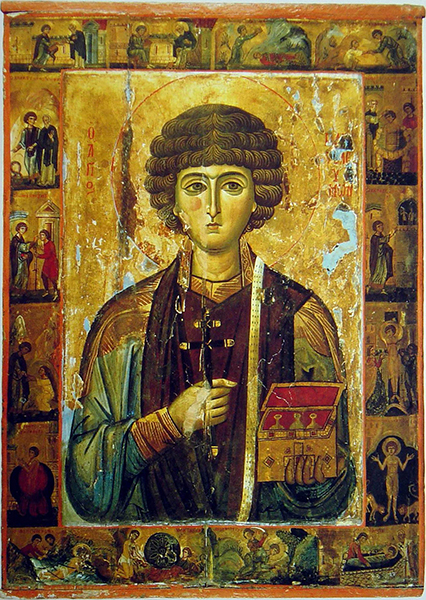 «Великомученик Пантелеимон родился в 275 году от Рождества Христова в Никомедии. Обучившись врачебному искусству, юный целитель уверовал во Христа после того, как по молитве Спасителю воскресил младенца, погибшего от укуса змеи. Лекарь перестал брать плату за свою работу и осмелился врачевать христиан, многие из которых находились в заточении. Это вызвало гнев императора-язычника Максимиана, повелевшего истязать целителя. После страшных пыток Пантелеимону отсекли голову, но из раны вместо крови потекло молоко, а маслина, к которой был привязан великомученик, тут же покрылась плодами...»