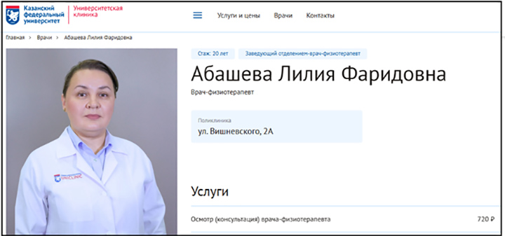 Попасть на приём к жене министра можно за 720 рублей // Скриншот с сайта uniclinic.kpfu.ru