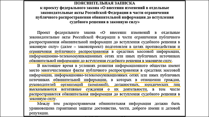 Ограничить распространение "обвинительной информации" предлагается в том числе в интересах руководителей компаний и должностных лиц // Скриншот пояснительной записки к законопроекту