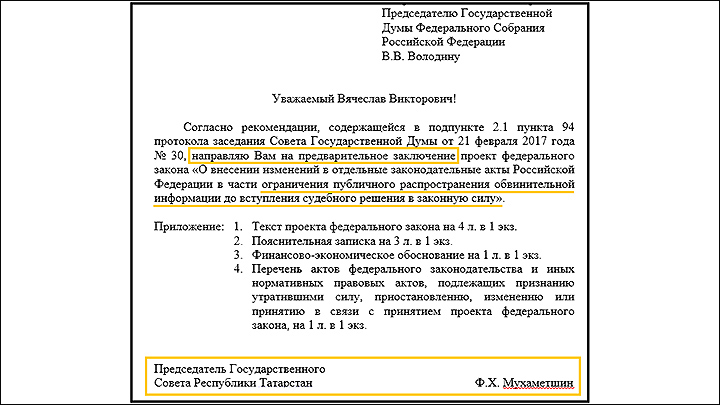 Пакет документов в Госдуму на имя спикера Вячеслава Володина направлен за подписью председателя Госсовета Татарстана Фарида Мухаметшина. Можно считать это "прощальным посланием", потому что спустя несколько дней он... досрочно покинул должность.