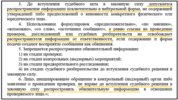А к "обвинительным" законодатели отнесли любые сведения, опубликованные до вступления в силу решения суда, если таковые "формируют убеждение", что тот или иной чиновник либо депутат совершил нечто противоправное, недобросовестное или вредоносное. Причём автора не спасут даже обтекаемые формулировки: