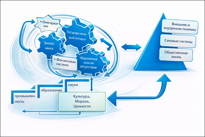Попытка разрывать отрасли внешней и внутренней политики, взгляды на госаппарат, борьбу с коррупцией, развитие силовых структур, цикл "образование – наука – промышленность – финансовая и социальная политика", модерируя каждый из них в отдельности не на инструментальном (здесь все понятно – под каждую задачу своё ведомство), а на стратегическом уровне пробела миссии страны, приводит к разбалансировке и невозможности концентрации для решения амбициозных задач общенационального развития.