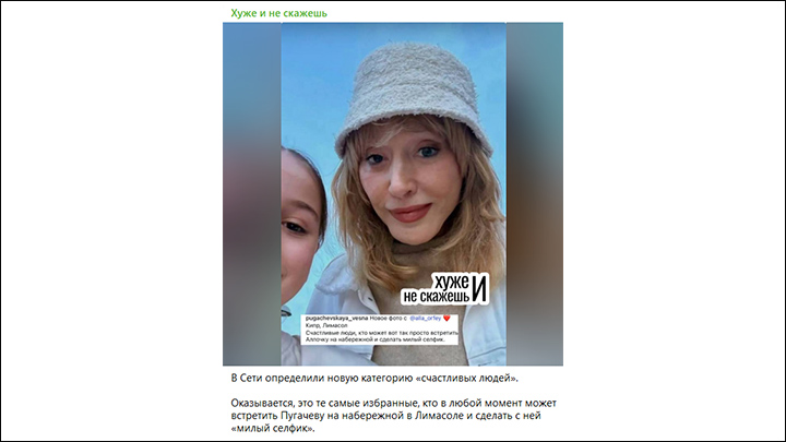 Туристы на Кипре иногда обращаются к Алле Пугачёвой с просьбой сфотографироваться с ними. Скриншот: тг-канал "Хуже и не скажешь"
