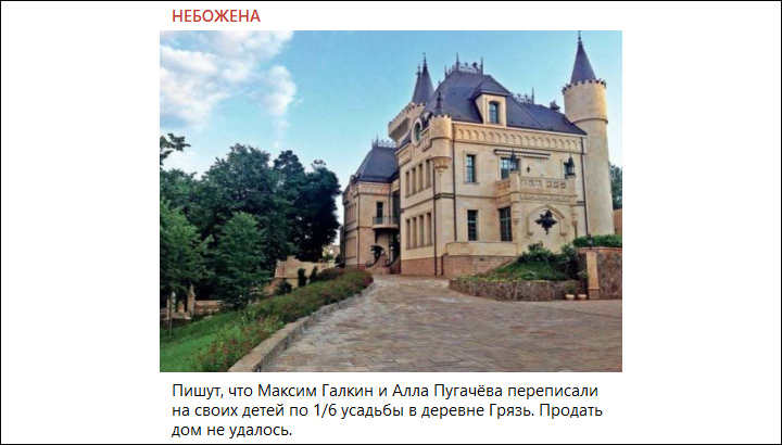 Напомним, Алла Пугачёва и Максим Галкин* больше не единственные хозяева своего знаменитого замка в подмосковной деревне Грязь. Недавно выяснилось, что звёздная чета переписала часть роскошной усадьбы на детей – 12-летних двойняшек Гарри и Лизу. Теперь сыну и дочке "примадонны" принадлежит по 1/6 доли замка. Остальное, как и прежде, оформлено на родителей.