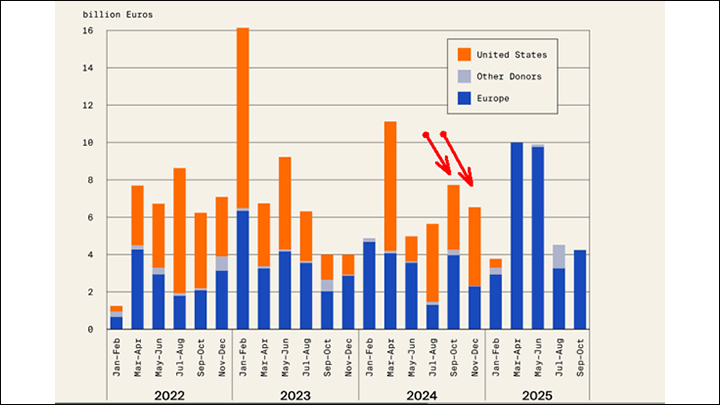 И несмотря на это, Европа потерпела фиаско в замещении американской помощи. В октябре, на момент составления отчёта, украинскому режиму было выделено всего 32,5 млрд евро, таким образом, для выхода на прежний уровень финансирования Европа в оставшиеся месяцы должна выделить порядка 9,1 млрд евро, фактически удвоив свои транши.