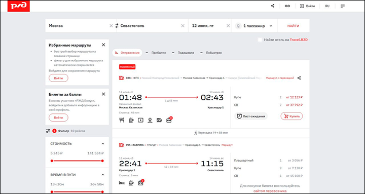 При попытке купить билеты в Севастополь РЖД предлагают маршруты других перевозчиков: либо ФПК, либо "Гранд". Скриншот: сайт РЖД