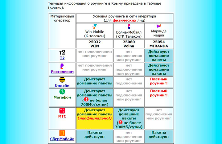 Многие операторы оставили "лазейки" – пакеты работают только в одной конкретной сети, а в остальных включается платный роуминг или дополнительные услуги по 300-400 рублей в сутки. Это связано с тем, что "большая четвёрка" операторов не имеет своих полноценных сетей в Крыму и подключается к трём местным операторам, заточенным под работу строго на полуострове: Win-Mobile, "Волна Мобайл", "Миранда медиа".