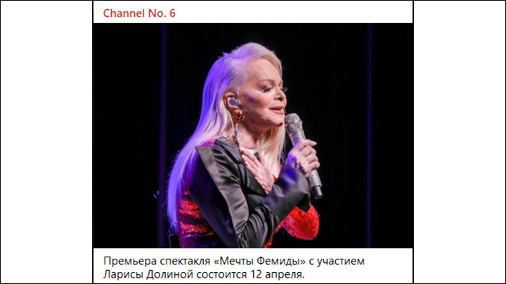 Премьера спектакля "Мечты Фемиды" с участием Ларисы Долиной состоится 12 апреля. Скриншот: ТГ-канал Chanel No.6