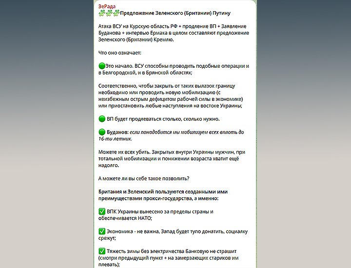 В свою очередь, украинский аналитический телеграм-канал "ЗеРада" также объяснил атаку ВСУ на Курскую область действиями Офиса президента Украины в интересах Запада под диктовку британских кураторов. В котором увидел сформулированное Киевом предложение Нового Мирового Порядка для Москвы.