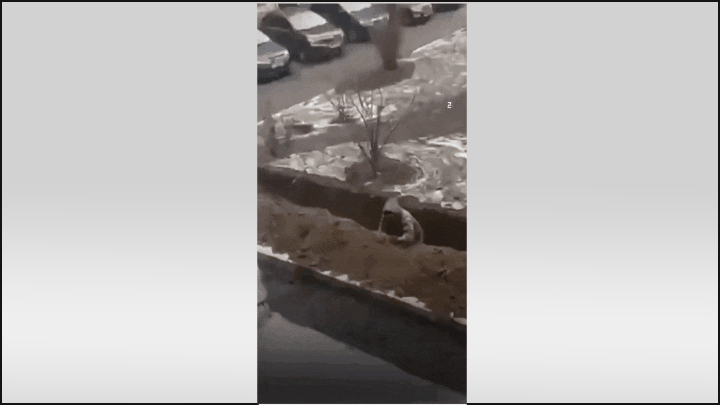 Мужчина одет в куртку цвета хаки, на голову наброшен капюшон. Сидит в траншее и тревожно оглядывается по сторонам. Объектив камеры, которая снимает его, выхватывает часть автостоянки, расположенной вблизи. Ролик, разлетевшийся по сеточке, сопровождается комментарием: