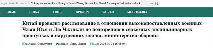 Очередными жертвами чистки стали зампред Центрального военного совета КНР Чжан Юся и глава Объединённого штаба ЦВС Лю Чжэньли. Они "подозреваются в серьёзных нарушениях дисциплины и закона", ЦК КПК принял решение начать в отношении них расследование, сообщила китайская армейская газета. Информацию подтвердил официальный представитель МО Китая Цзян Бинь на странице оборонного ведомства в WeChat.