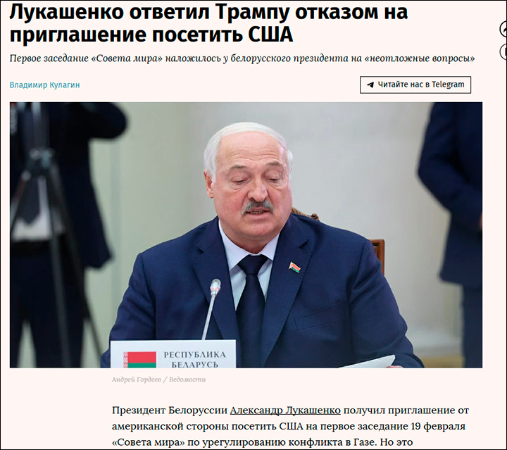 Президент Белоруссии Александр Лукашенко, принявший было приглашение Трампа присоединиться к "Совету мира", тоже отказался от участия в его первом заседании. В Минске весьма тактично заявили, что очень благодарны за приглашение – но график Александра Григорьевича уже согласован и пересмотреть его нет, дескать, никакой возможности. Видимо, вспомнил Батька, как один экс-госсекретарь Союзного государства съездил в США и чем это для него кончилось.