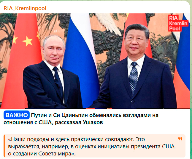 Оба пункта крайне важны. Они указывают на то, что Россия согласовывает тему "Совета мира" уж точно с Китаем, который в последний момент, как бы сквозь зубы, тоже получил от администрации Трампа приглашение поучаствовать в этом карманном ООН американского президента. Судя по словам Пескова – "от Кремля никто не планирует", – результат согласования отрицательный.