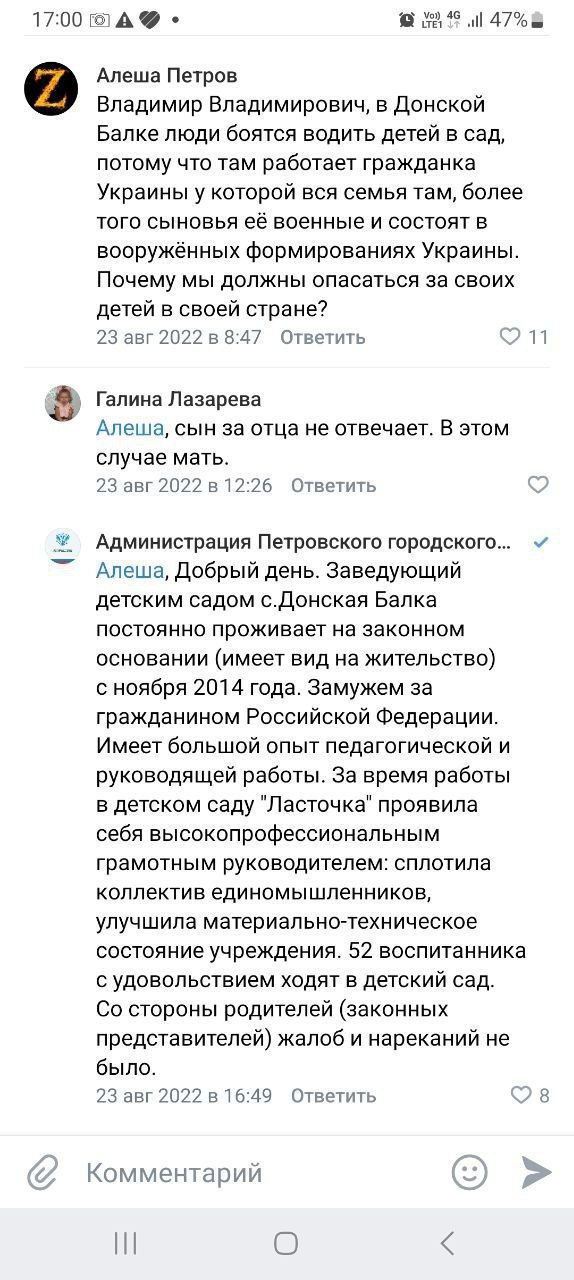 Но еще полтора года назад, когда началась спецоперация, родители детишек стали замечать странное. Заведующая открыто говорила, что на Украине у неё остались родственники и сыновья, которые, судя по её словам, военные и вступили в ряды теробороны. Не единожды осуждала спецоперацию и давала понять, что все её участники – её личные враги.