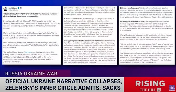 Другой миллиардер из США Дэвид Сакс критиковал выделение Киеву огромного денежного транша. Не хотел, чтобы украинская "мясорубка" включалась, обеспечивая американской оборонке жирные барыши. Позиция Сакса выражает мнение большей части республиканцев и консерваторов в США. Ранее в интервью газете The Hill он предрекал этому "больному, агонизирующему государству" полный крах из-за несговорчивости Зеленского.