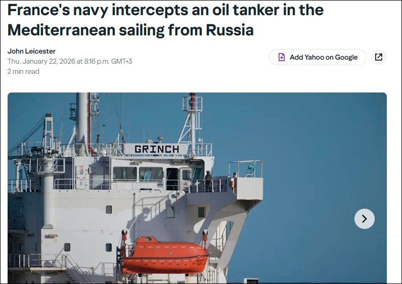 И сделал это француз аккурат в тот момент, когда Зеленский с трибуны Давоса разносил в пух и прах своих "союзников" за недостаточную помощь Украине. В том числе за то, что слишком уж неактивно, по его мнению, идёт борьба с "русским теневым флотом".