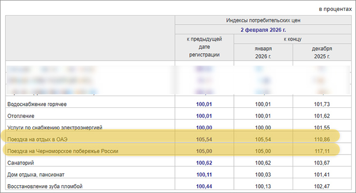 Оказалось, что в расчёт недельной инфляции Росстат включил поездки на Чёрное море и в Объединённые Арабские Эмираты. С черноморским побережьем более-менее понятно, хоть уже явно не сезон, но неужели жители России настолько сказочно улучшили свои доходы, что массово и регулярно (!) стали летать на отдых в ОАЭ?