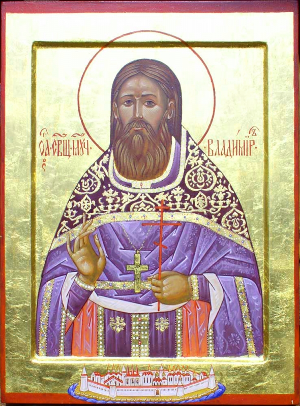 «Настоятель не уступал ни уговорам, ни угрозам обновленцев, а потому храм захватить не удалось. Однако уже в 1925 году отца Владимира впервые арестовали. Поначалу он дал согласие сотрудничать с чекистами и был освобожден, но вскоре покаялся в этом малодушии и был арестован вновь. Началась долгая череда тюрем и лагерей, завершившаяся в 1937-м расстрелом на трагически известном подмосковном Бутовском полигоне...»