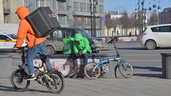 – Я первый день работаю, – рассказывает курьер в жёлтой форме. Меня мой друг-коллега учит, что к чему. Поэтому вместе сидим.