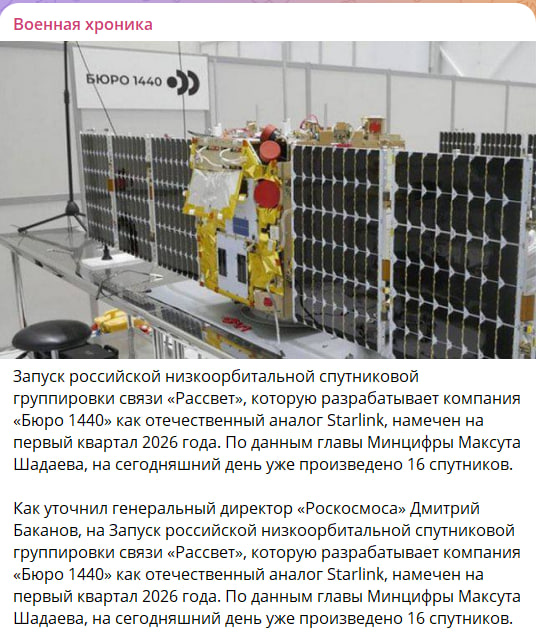 Российский "Старлинк" запустят этой весной. Запуск российской низкоорбитальной спутниковой группировки связи "Рассвет", разрабатываемой частной компанией "Бюро 1440", намечен на первый квартал 2026-го. <…> Глава Минцифры Максут Шадаев сообщил, что на сегодняшний день уже произведено 16 спутников, готовых к выводу на орбиту. Таким образом, уже скоро российский аналог "Старлинка" сможет выйти на этап опытной эксплуатации. Конечно, 16 космических аппаратов не хватит для нужд военных, но появится возможность хотя бы протестировать новую систему.